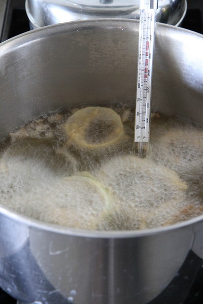 Chuẩn bị một chảo dầu nóng, cho tôm và hành tây khoanh vào chiên, đến khi cả tôm và hành đều chuyển sang màu vàng nâu thì bạn vớt ra, đặt lên khăn ăn cho thấm ráo dầu.